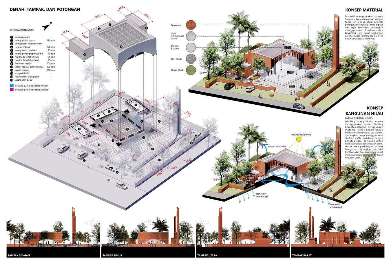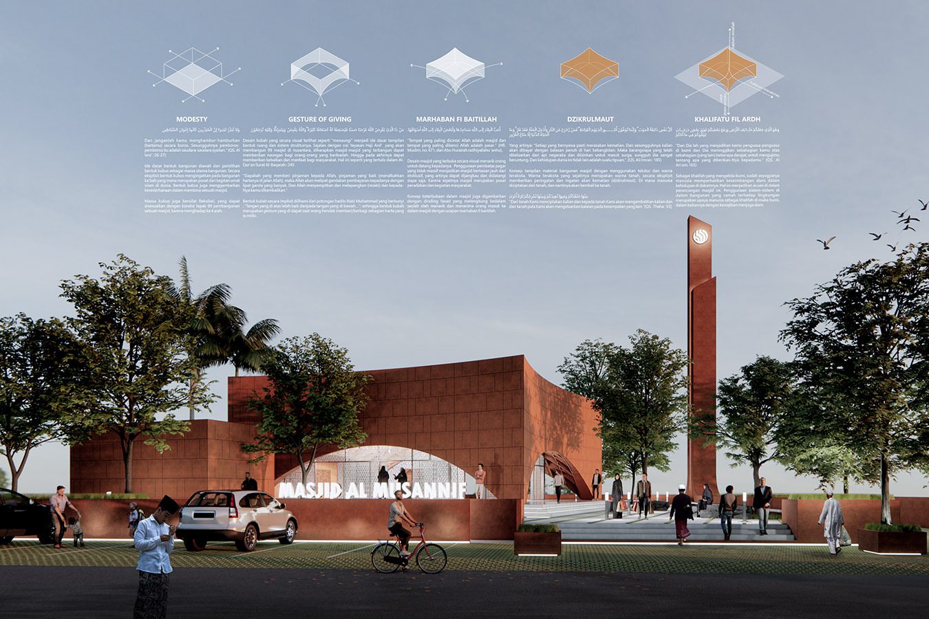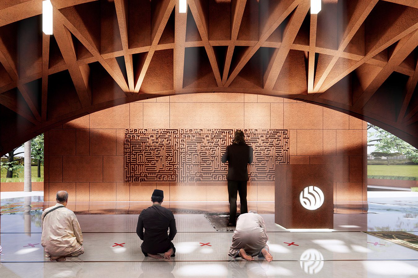 Selain sebagai tempat ibadah, masjid diharapkan dapat berfungsi sebagai tempat “berkontemplasi”. Tempat manusia memikirkan perannya sebagai hamba bagi Tuhannya. Yang suatu saat akan meninggalkan harta, kedudukan dan jabatan ketika kembali kepada sang penciptanya. Nilai – nilai inilah yang tercermin di dalam desain masjid dengan tampilan sederhana tanpa ornamen dan kemewahan. Hanya tampak dinding dan atap bertekstur tanah yang melingkungi. Mengingatkan pada akhir kehidupan manusia yang pada akhirnya akan dikubur di dalam tanah.