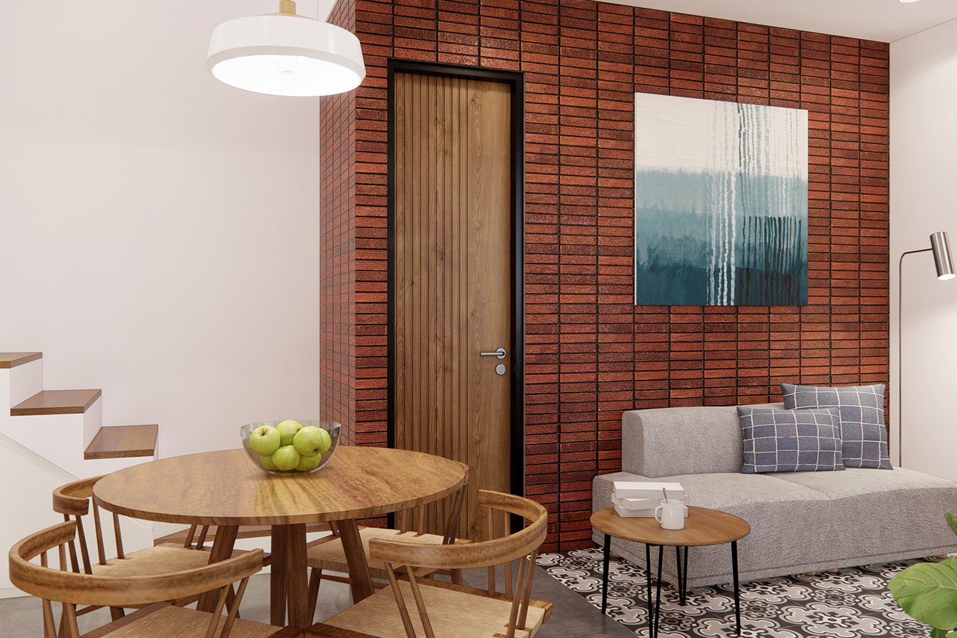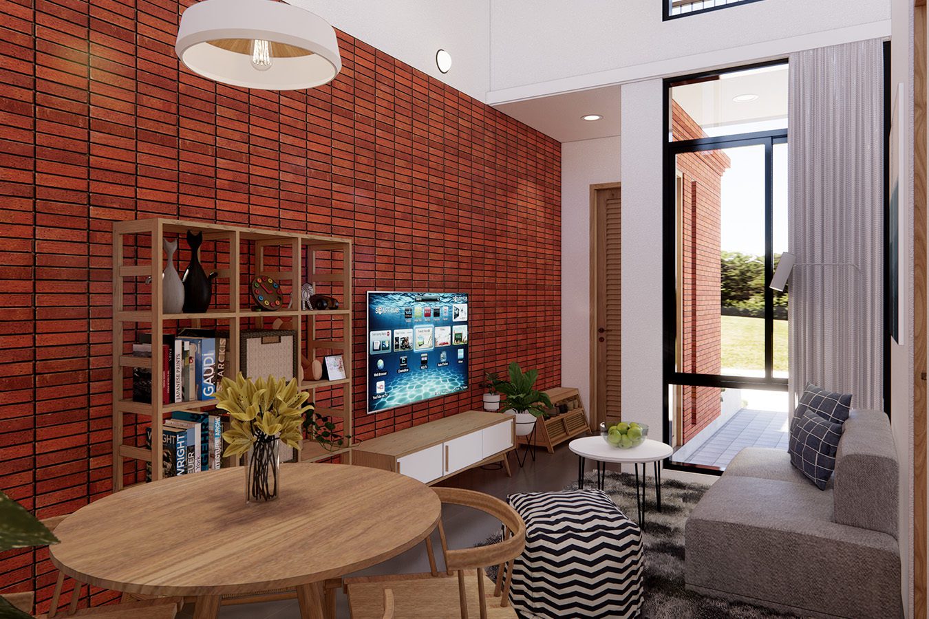 Padabagian interior, desain dibuat lebih modern dengan permainan material yang berkesan hangat dan nyaman. Lantai pola kayu, dinding tekstur bata tempel, dan interior dominan kayu menciptakan tampilan yang cozy dan hommy.